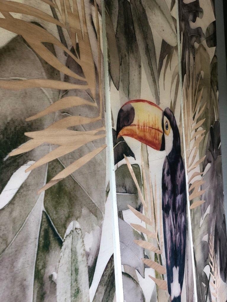 Deze Daira wandpanelen brengen je muur tot leven. Bestaande uit een 3-luik met een vrolijke bloemen en vogel print. Maar het bijzondere aan deze panelen is dat naast de leuke afbeelding er een 3d werking zit in het hout. Op de lijn van de bloemen en het blad. Dit geeft een speels effect. Gaaf voor boven de bank of in de slaapkamer.